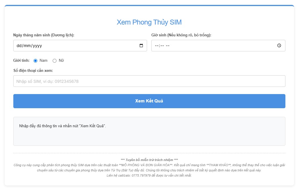 Công cụ này cung cấp phân tích phong thủy SIM dựa trên các thuật toán **MÔ PHỎNG VÀ ĐƠN GIẢN HÓA**. Kết quả chỉ mang tính **THAM KHẢO**, không thể thay thế cho việc luận giải chuyên sâu từ các chuyên gia phong thủy dựa trên Tứ Trụ (Bát Tự) đầy đủ. Chúng tôi không chịu trách nhiệm về bất kỳ quyết định nào dựa trên kết quả này.